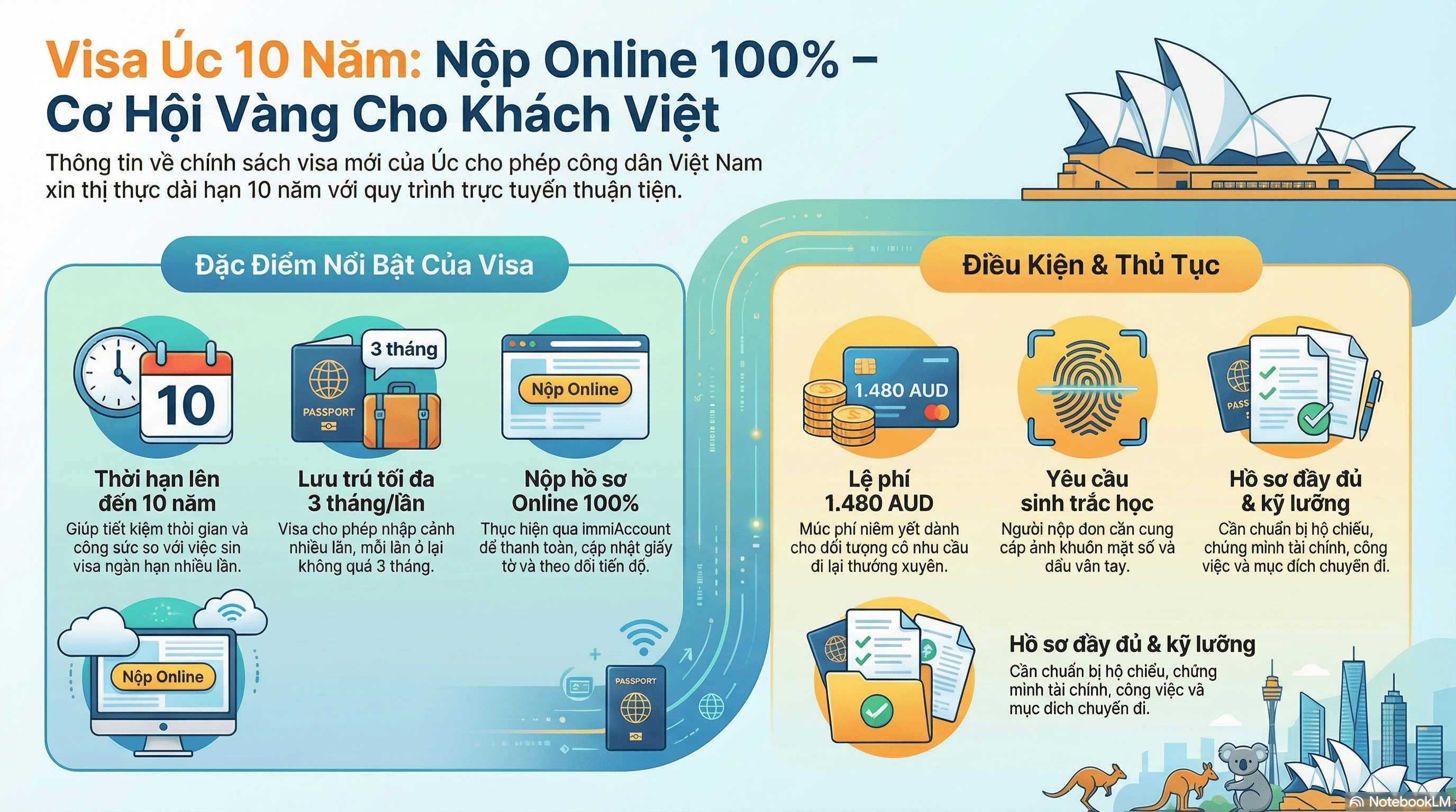 Úc luôn là điểm đến mơ ước không chỉ bởi cảnh quan thiên nhiên kỳ vĩ mà còn bởi nền giáo dục đẳng cấp thế giới. Mới đây, một thông tin cực vui từ Bộ Nội vụ Australia đã mở ra cơ hội lớn cho công dân Việt Nam: Visa Úc diện Frequent Traveller hiện đã cho phép thời hạn lên đến 10 năm và hỗ trợ nộp hồ sơ online 100%.